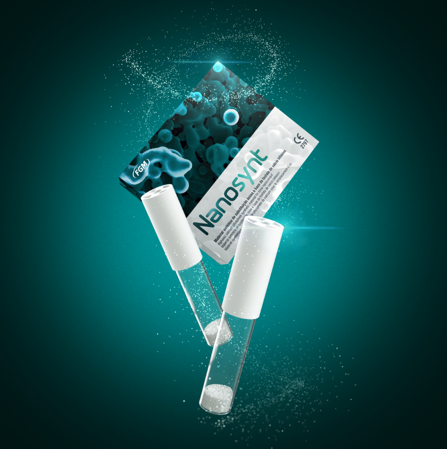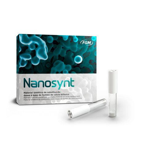 Nanosynt é um material sintético de substituição óssea, à base de fosfato de cálcio bifásico (60% de hidroxiapatita e 40% de ß-fosfato tricálcico), não tóxico, radiopaco e de alta biocompatibilidade. Possui excelente ação osteocondutora, sendo reabsorvido e substituído por tecido ósseo vivo durante a remodelação óssea.